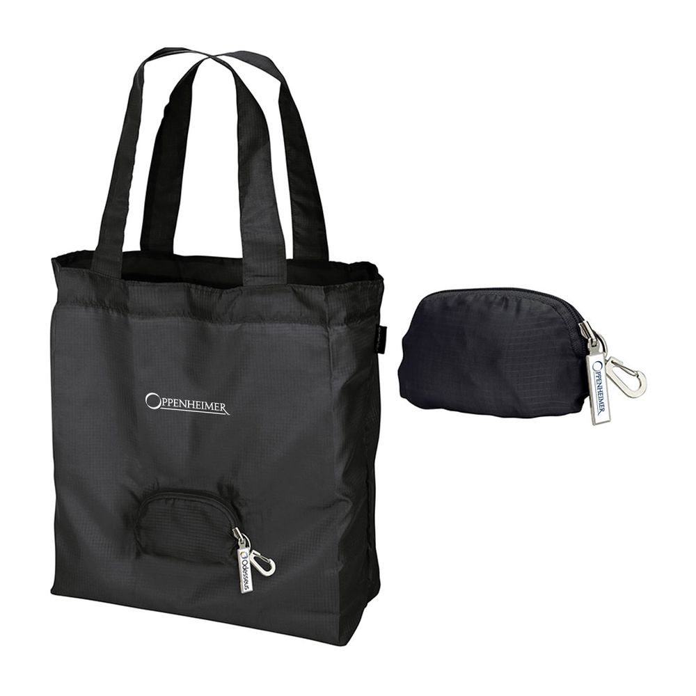 The Foldable Tote features 26" handles, a mini bag with a lobster clip that converts to tote with zip pocket. Features your logo.