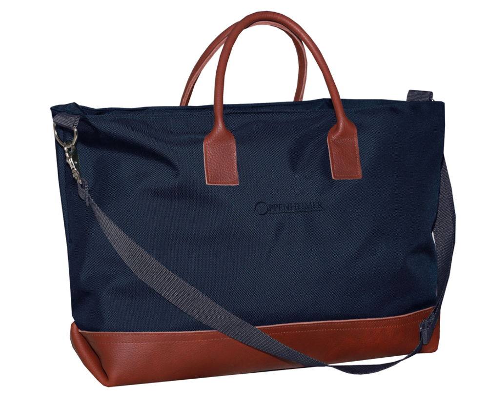 The Boston Tote features two inside zippered pockets, a removable shoulder strap, and a leather bottom and handles with tone-on-tone contrast stitching. Features your logo embroidered on the bag.